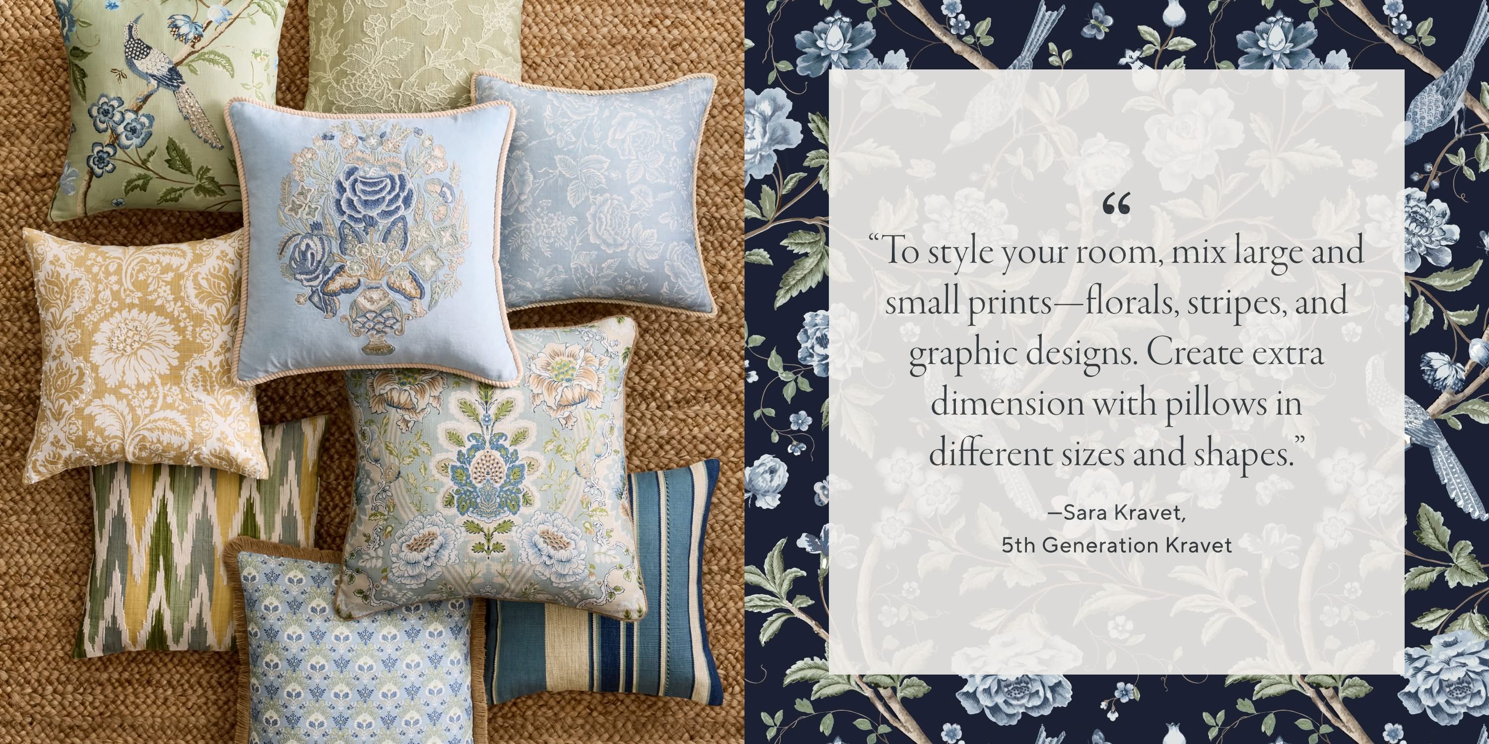 - Curated kravet pillows in square and lumbar shapes.